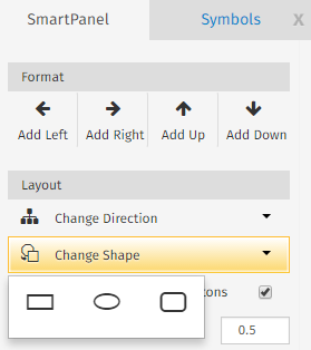 To add decision shapes, first select a shape from your Work Area then click on one of the arrows in the Format section of the SmartPanel. Choose from Add Left, Add Right, Add Up, or Add Down.