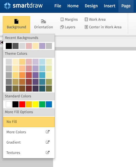 Background SmartDraw Software June 17, 2019 18:17 Follow Change the background appearance by clicking Background from the Page tab. Select from colors, gradients, or textures. Comments 0 comments Article is closed for comments.